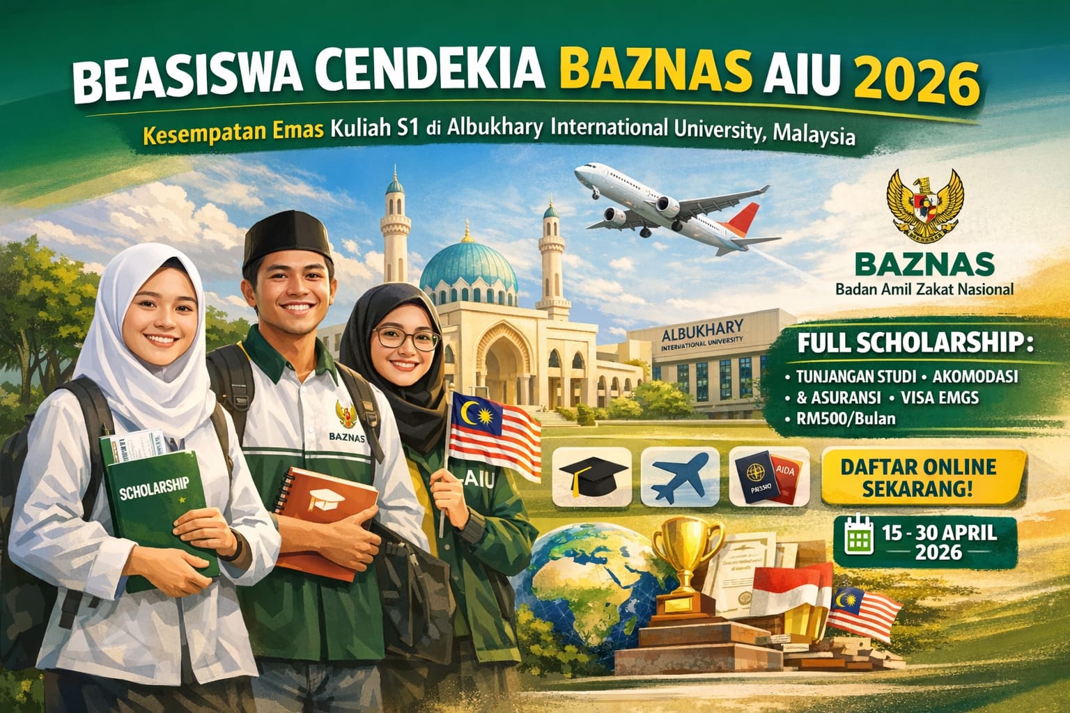 Badan Amil Zakat Nasional (BAZNAS) kembali membuka program Beasiswa Cendekia BAZNAS (BCB) untuk Albukhary International University (AIU) Malaysia Batch 5 Tahun 2026. Program ini menyasar lulusan SMA sederajat dari keluarga kurang mampu agar dapat melanjutkan studi S1 melalui skema beasiswa penuh. Pendaftaran dibuka mulai 15 hingga 30 April 2026 dengan kuota sebanyak 40 penerima.