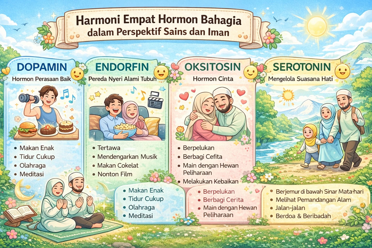 Dari perspektif ilmiah dan keislaman, kebahagiaan sejati bukan sekadar mengejar kesenangan sesaat, tetapi membangun keseimbangan antara tubuh, pikiran, dan jiwa. Islam telah lama mengajarkan pola hidup yang mendukung keseimbangan hormon ini: makan yang baik, tidur cukup, menjaga silaturahmi, serta mendekatkan diri kepada Allah.