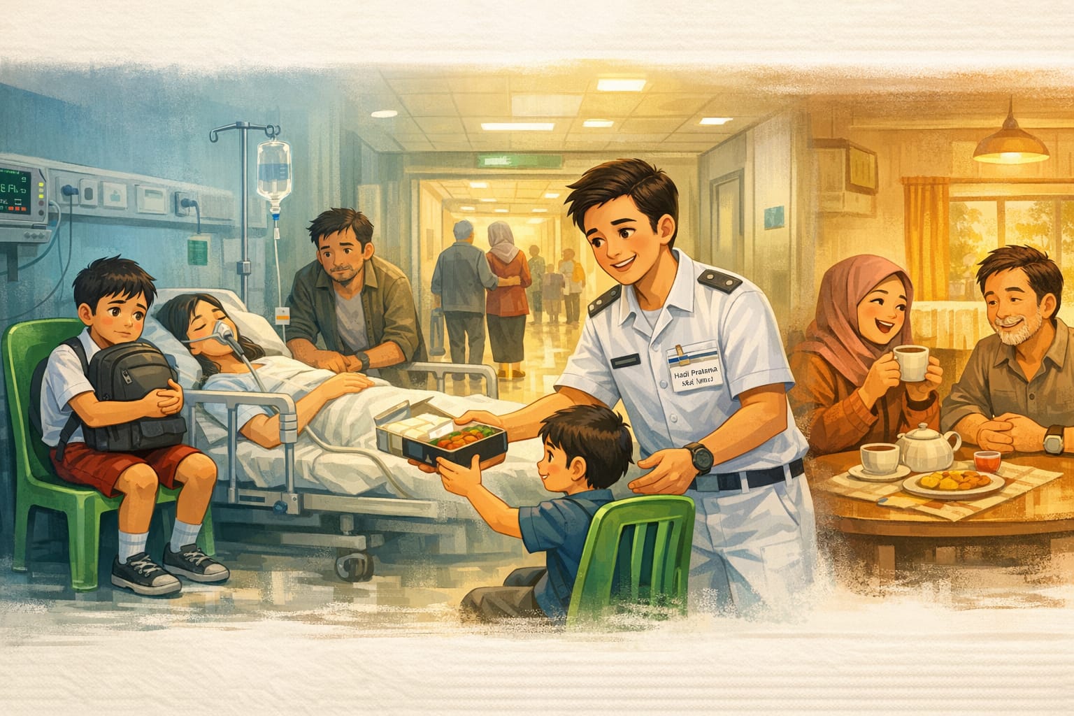 Perawat itu duduk sebentar di kursi plastik hijau. “Saya dulu juga pernah di posisi kamu,” katanya pelan. “Menemani ibu saya di bangsal seperti ini.”