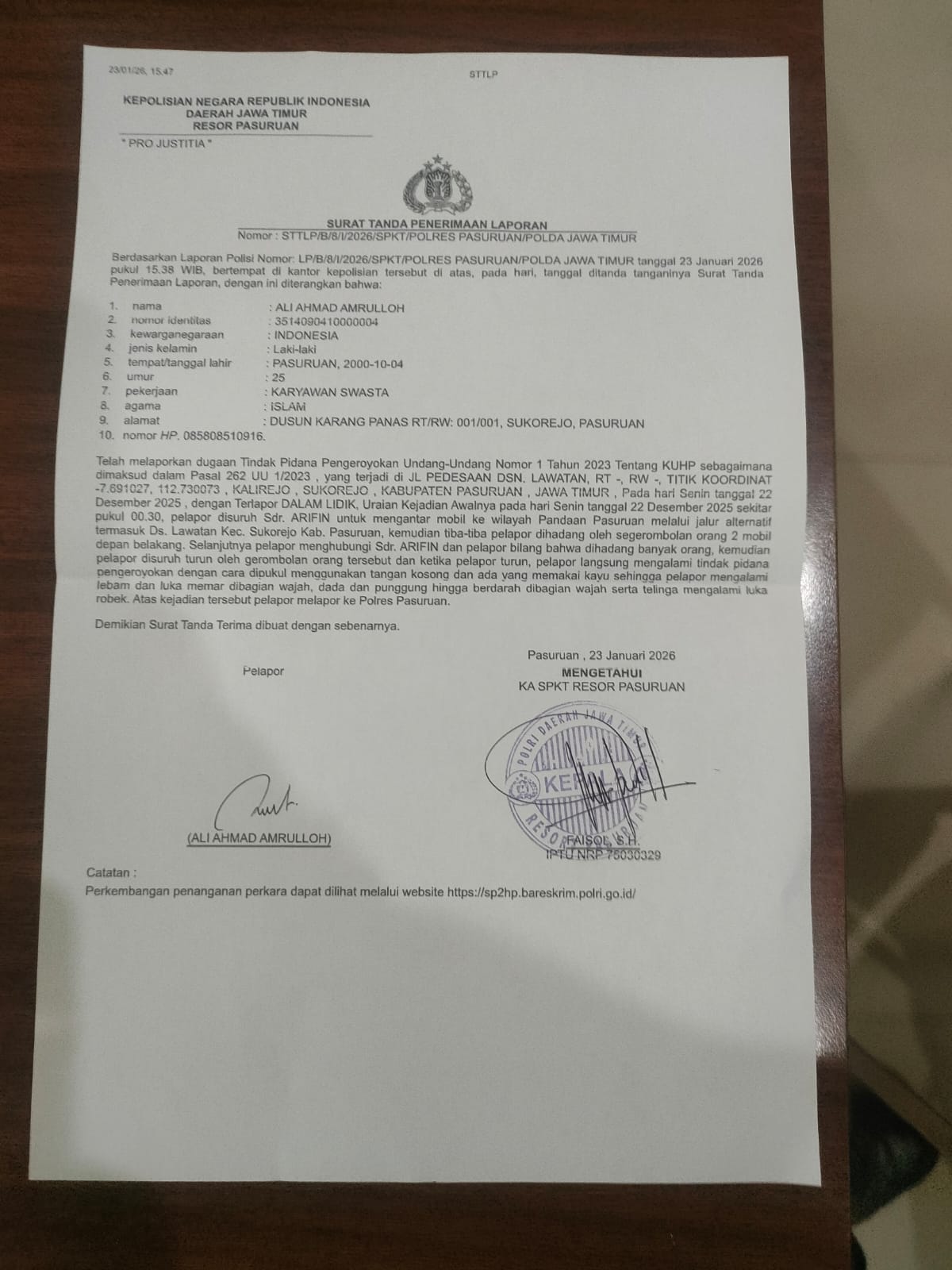 “Pelapor langsung mengalami tindak pidana pengeroyokan dengan cara dipukul menggunakan tangan kosong dan ada yang memakai kayu,” ungkap Ali Ahmad Amrulloh dengan nada kecewa saat ditemui awak media, Kamis (2/4/2026).