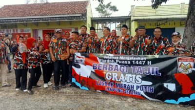 KALIANDA – Mengisi momentum bulan suci Ramadan 1447 H, jajaran pengurus Markas Cabang (Marcab) dan Markas Anak Cabang (MAC) Laskar Merah Putih (LMP) Kabupaten Lampung Selatan menggelar aksi sosial pembagian ratusan paket takjil yang ditutup dengan agenda buka puasa bersama di D’Sas Cafe & Resto, Rabu (4/3/2026).