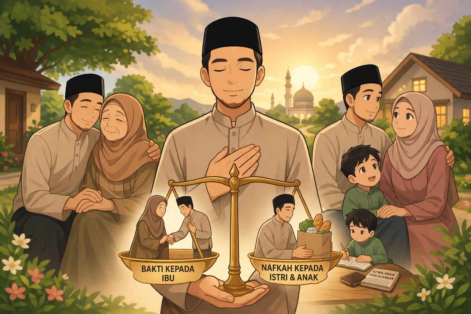 Ketika ibu membutuhkan bantuan dalam kesulitan, maka membantu beliau adalah kewajiban moral dan bentuk bakti yang tidak boleh diabaikan. Namun ketika istri dan anak membutuhkan nafkah, maka itu adalah kewajiban utama yang tidak boleh ditunda. Menempatkan sesuatu pada tempatnya adalah bentuk keadilan yang diperintahkan dalam Islam.