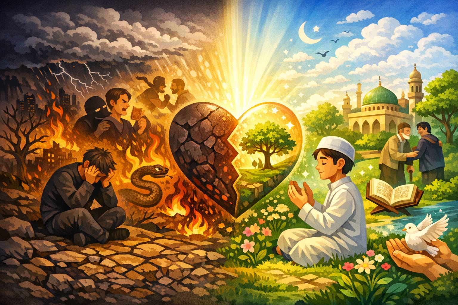 Di dalam diri setiap manusia tersimpan dua potensi yang saling bertarung. Satu mengarah pada cahaya ketakwaan, satu lagi menuju gelapnya kefasikan. Al Qur’an menegaskan bahwa sumber kebaikan maupun keburukan tidak selalu datang dari luar, tetapi lahir dari dalam jiwa manusia sendiri. Karena itu, perjuangan terbesar manusia adalah menata dan membersihkan hatinya.