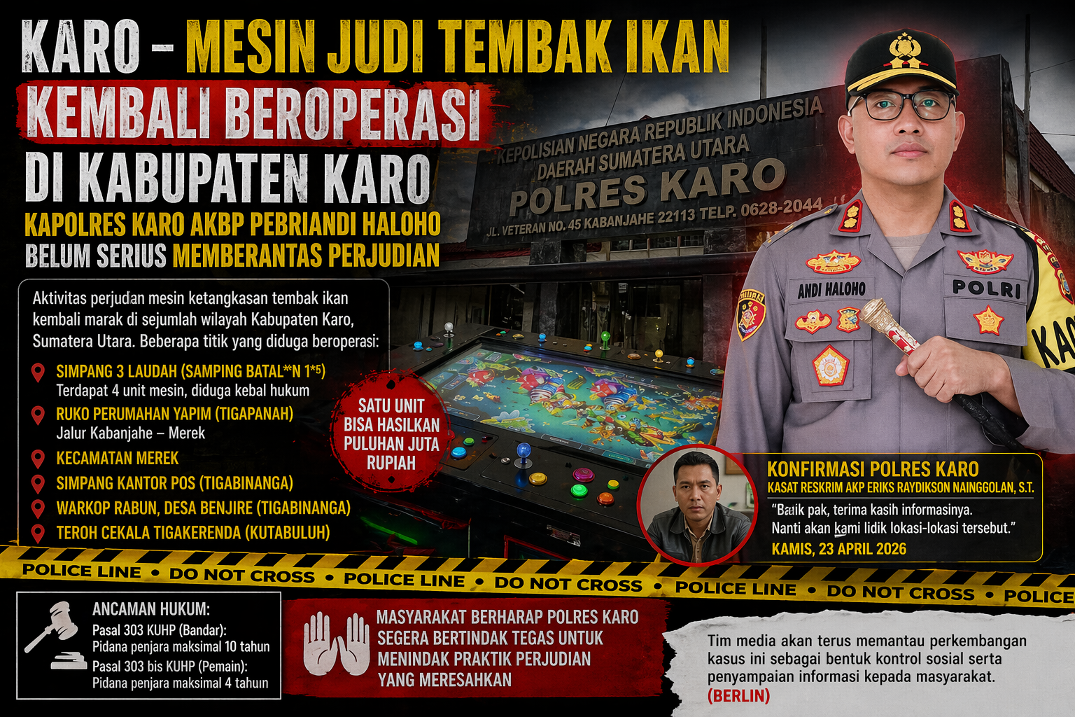Menanggapi hal tersebut, pihak Polres Karo melalui Kasat Reskrim AKP Eriks Raydikson Nainggolan menyatakan akan menindaklanjuti laporan yang masuk.
