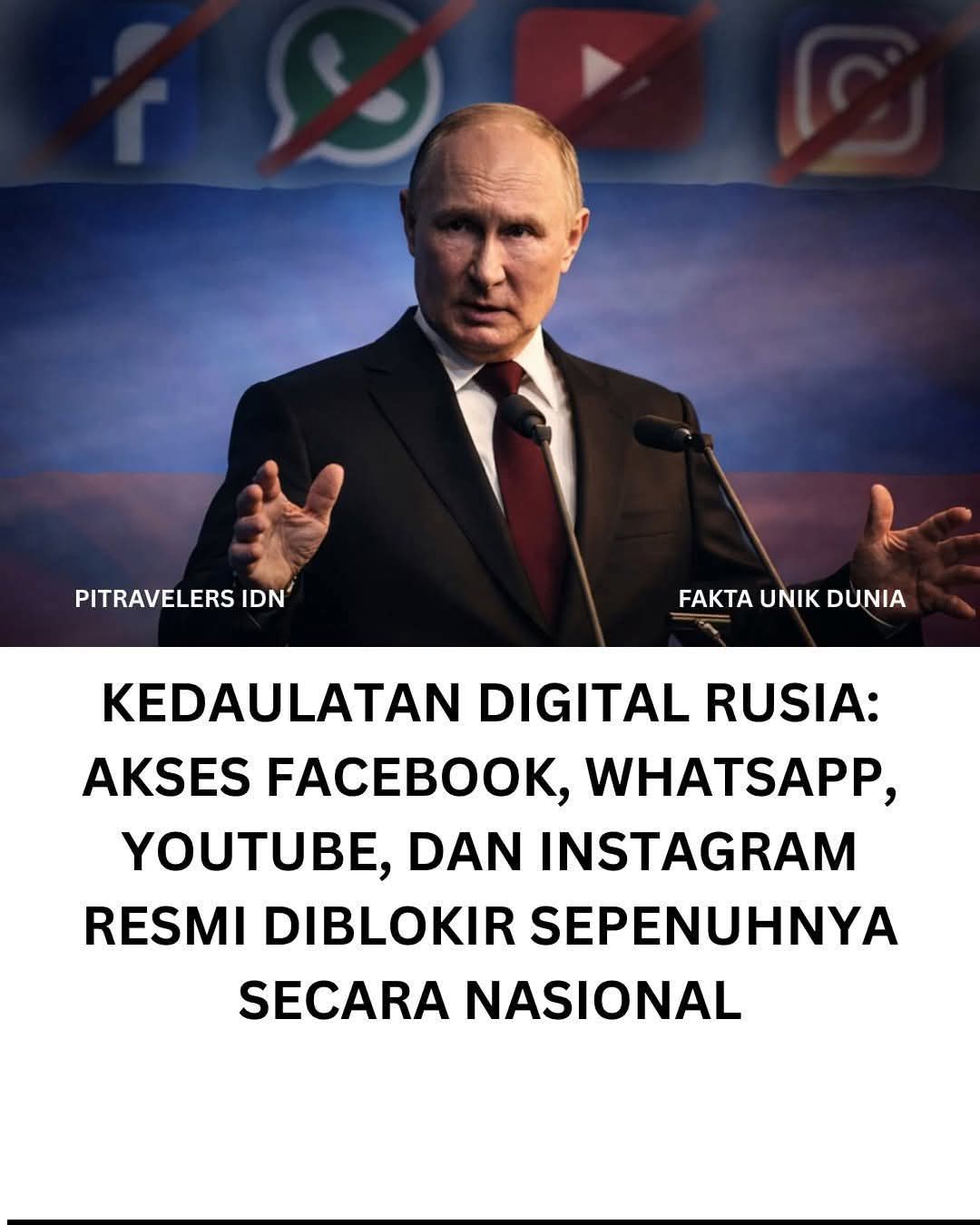Pemerintah Rusia secara resmi telah memperketat cengkeraman kontrol komunikasinya dengan memblokir total akses ke berbagai platform media sosial besar asal Amerika Serikat. Facebook, Instagram, YouTube, dan WhatsApp kini sudah tidak dapat diakses lagi oleh jutaan pengguna di Rusia setelah pemerintah menghapus platform-platform tersebut dari sistem domain nasional.