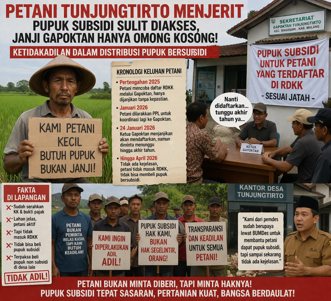 Kabupaten Malang – Akses pupuk bersubsidi kembali menjadi sorotan tajam. Kali ini, jeritan datang dari petani kecil di Desa Tunjungtirto, Kecamatan Singosari, yang merasa dipinggirkan dari hak dasar mereka. Persoalan ini mencuat dari kelompok tani 890273 – BINA TIRTA IV subsektor tanaman pangan padi, yang dinilai gagal menghadirkan pemerataan distribusi pupuk subsidi.