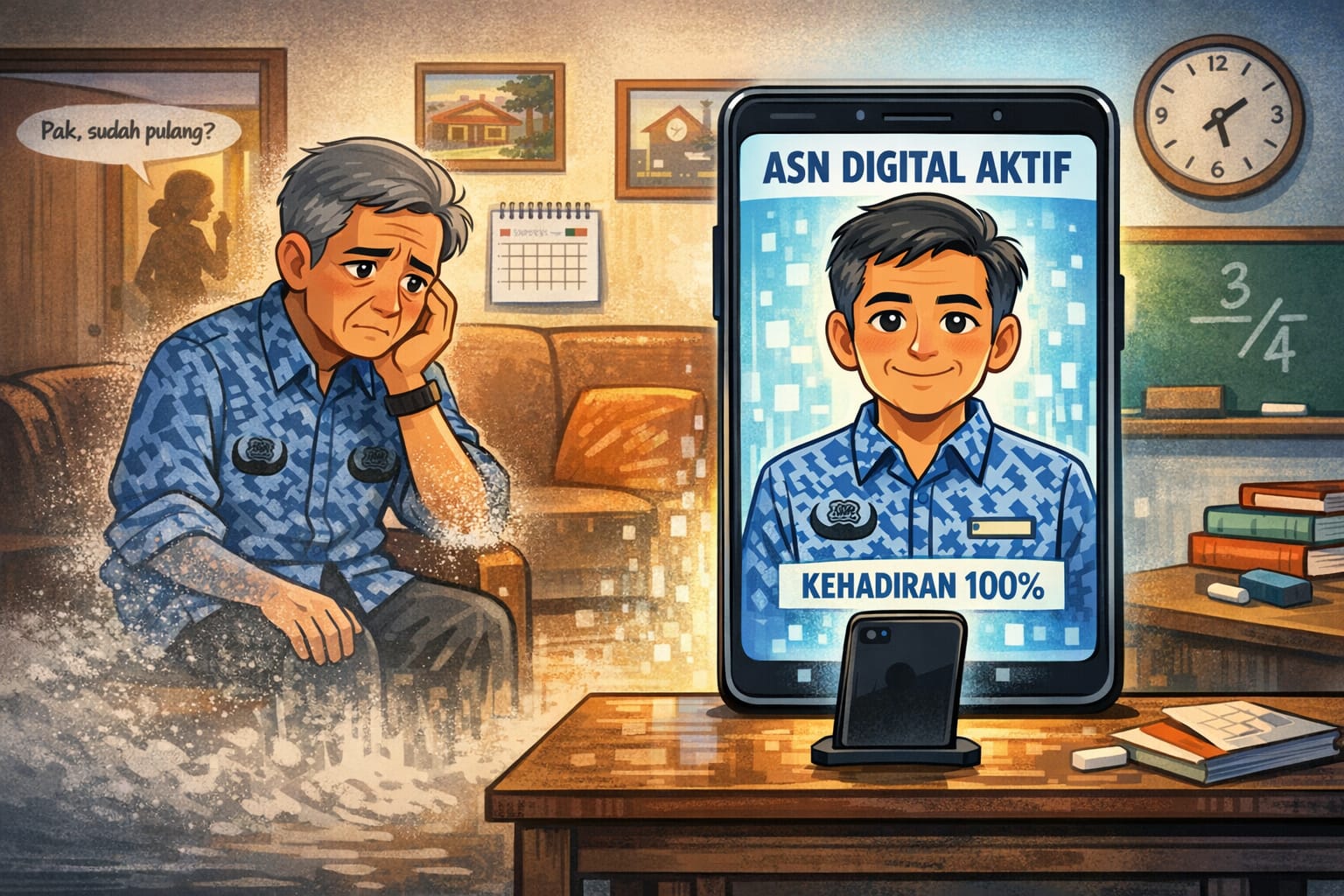 Pak Darma duduk diam tanpa apa pun di tangannya. Untuk pertama kalinya sejak diangkat menjadi pegawai negeri, ia merasa tertinggal oleh zaman yang bergerak terlalu cepat tanpa menoleh.